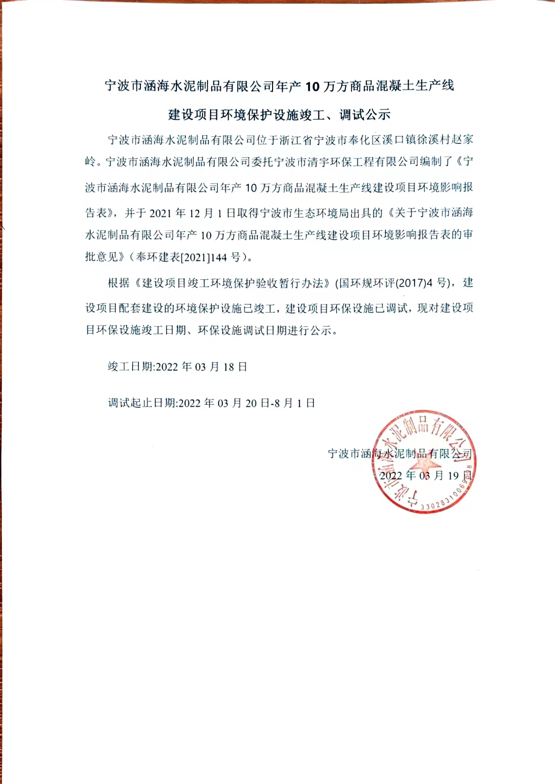 寧波市涵海水泥制品有限公司年產10萬方商品混凝土生產線建設項目環保設施竣工、調試公示
