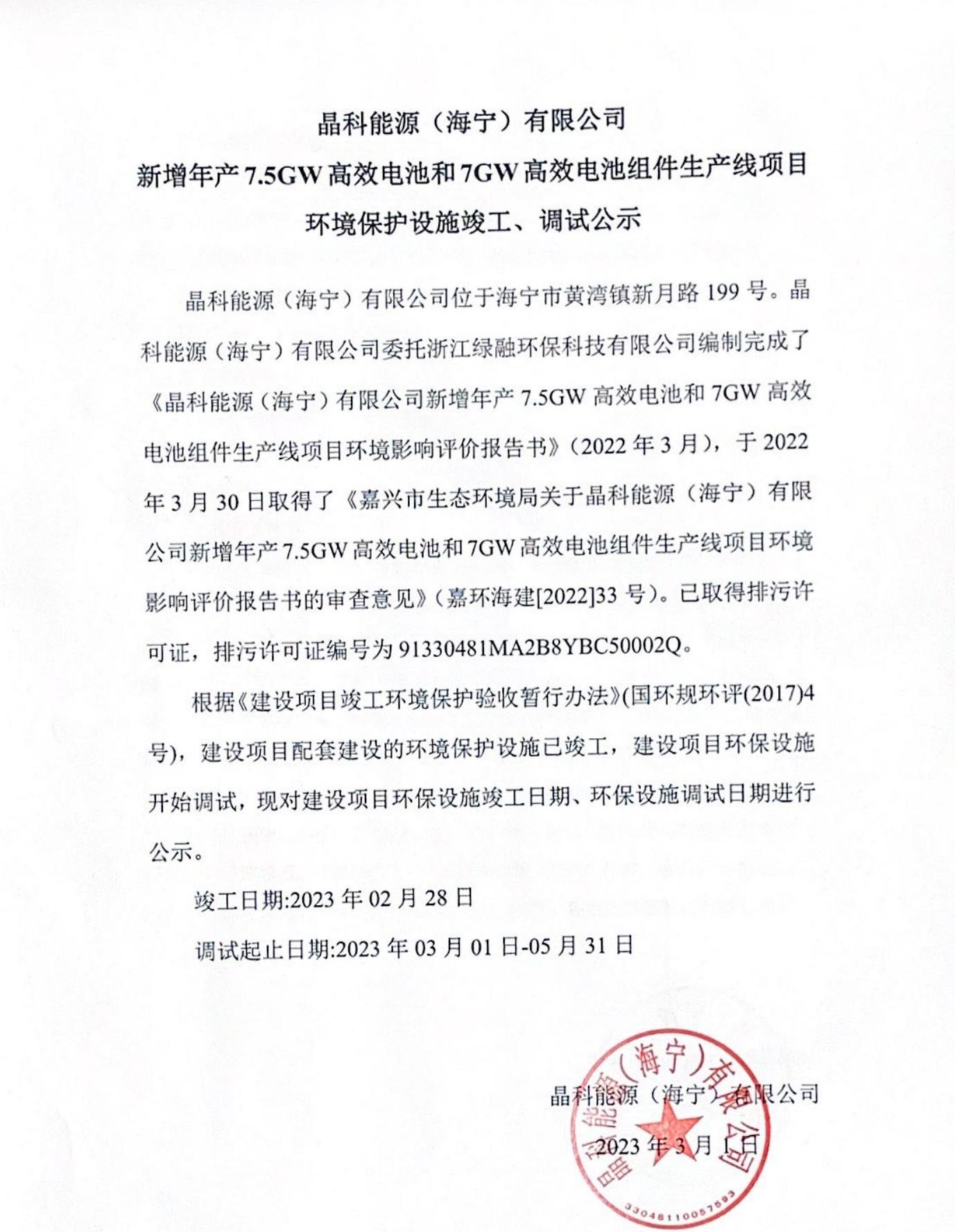 晶科能源(海寧)有限公司新增年產(chǎn)7.5GW高效電池和7GW高效電池組件生產(chǎn)線項(xiàng)目環(huán)保設(shè)施竣工、調(diào)試公示